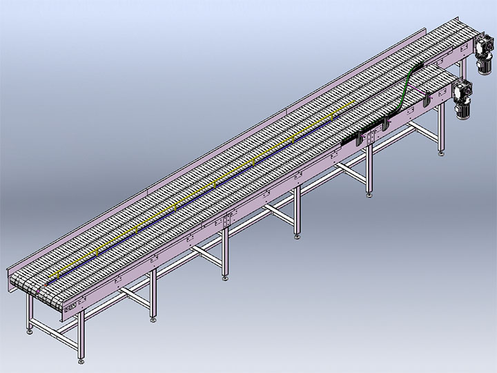 鏈板輸送機(jī)是一種以標(biāo)準(zhǔn)鏈板為承載面,由馬達(dá)減速機(jī)為動(dòng)力傳動(dòng)的傳送裝置。鏈板式輸送機(jī),由動(dòng)力裝置(電機(jī))、傳動(dòng)軸、滾筒、張緊裝置、鏈輪、鏈條、軸承、潤滑劑、鏈板等等構(gòu)成。其中帶動(dòng)物料的輸送的主要的兩個(gè)部分為:鏈條,利用它的循環(huán)往復(fù)運(yùn)動(dòng)提供牽引動(dòng)力;金屬板,作為輸送過程中的承載體??梢酝ㄟ^多列鏈板并行,使鏈板輸送機(jī)做的很寬并形成差速,利用多列鏈板的速度差使多列輸送在無擠壓的情況下變?yōu)閱瘟休斔?,從而滿足飲料貼標(biāo)、灌裝、清洗等設(shè)備的單列輸送的要求,我們可以將兩條鏈板輸送機(jī)的頭尾部做成重疊式的混合鏈?zhǔn)沟闷浚ü蓿w處于動(dòng)態(tài)過度狀態(tài),使輸送線上不滯留物料,可以滿足空瓶以及實(shí)瓶壓力和無壓力輸送。